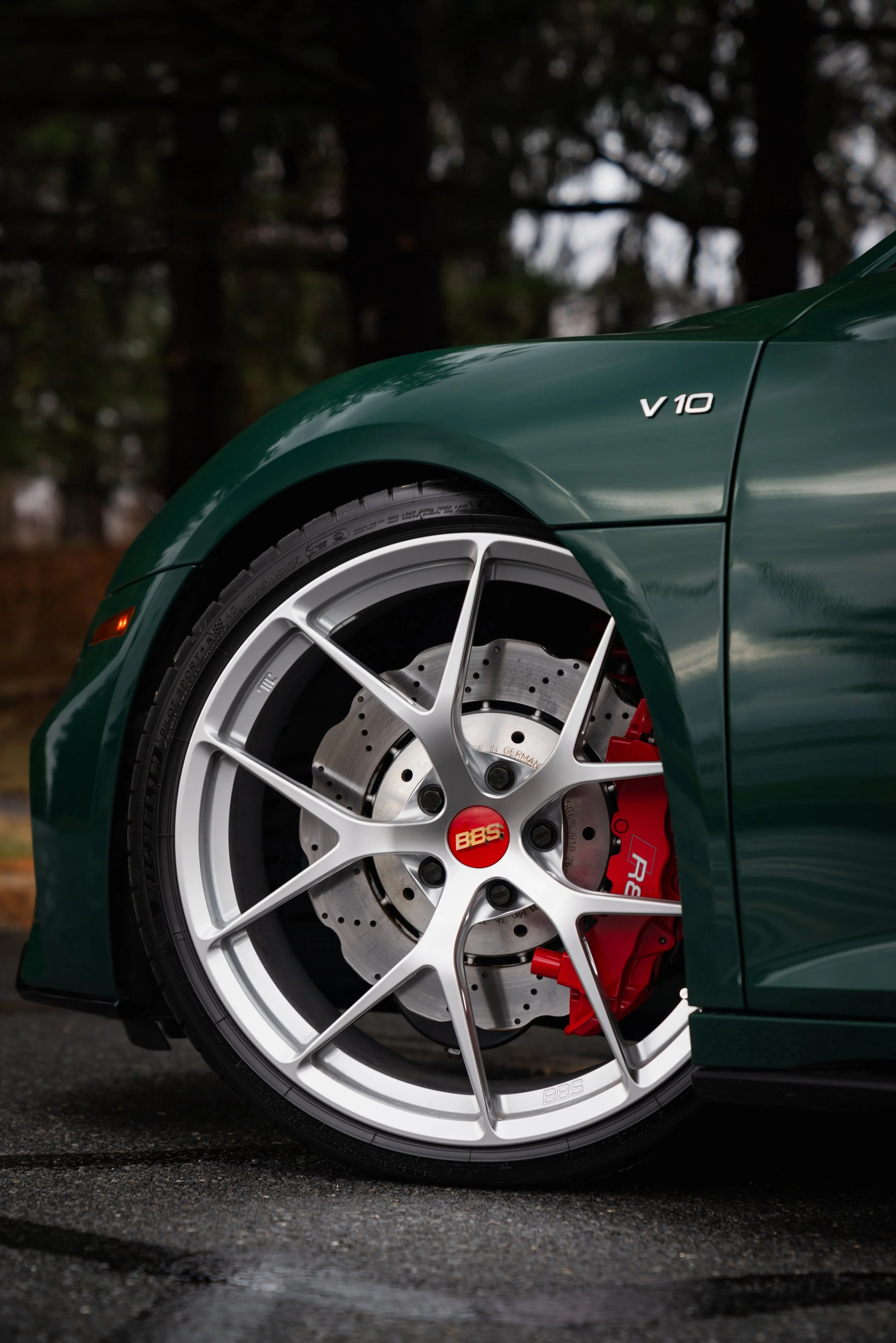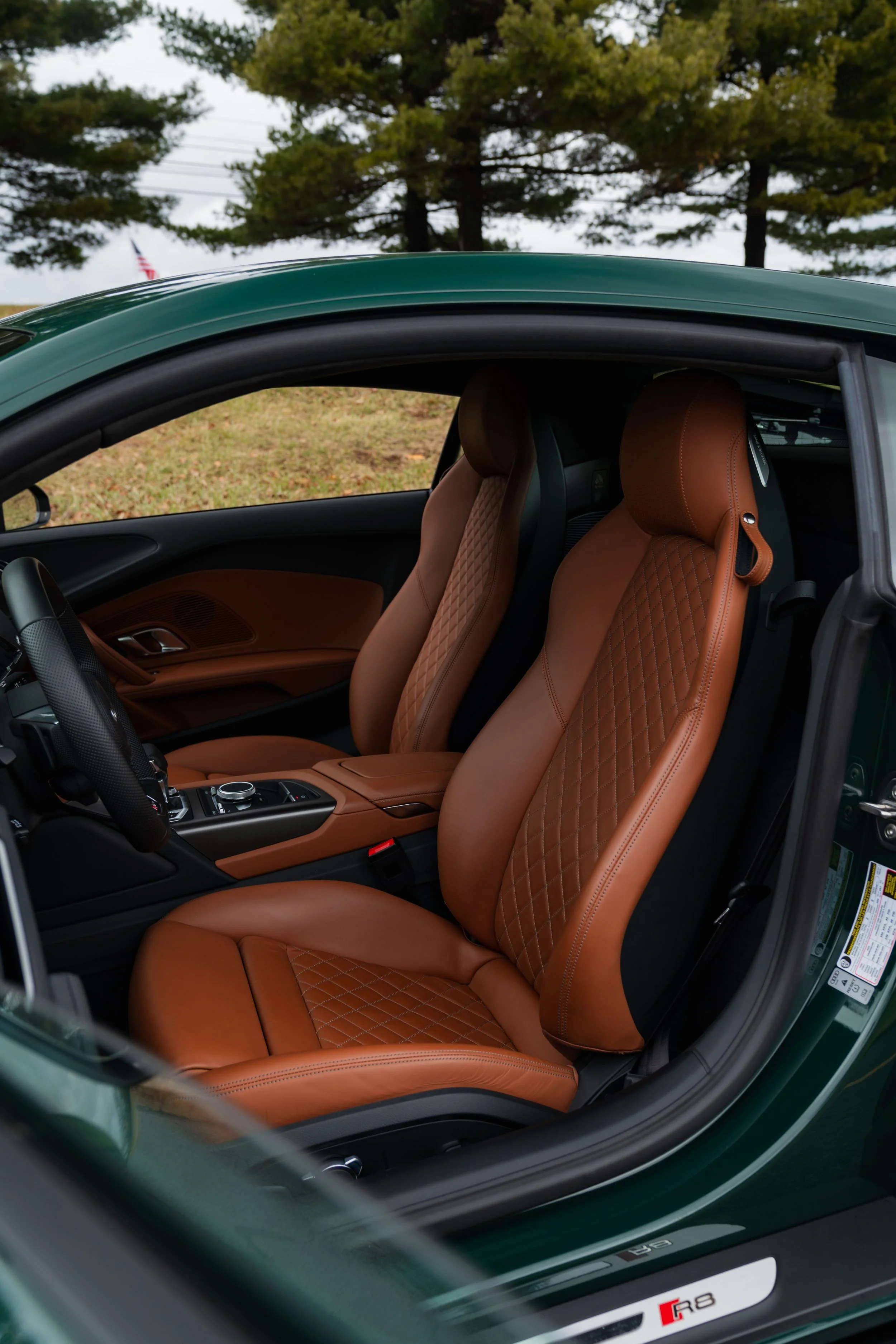 This 2021 R8 spec is a showcase of timeless design and modern engineering. Finished in a rare Goodwood Green, the paintwork shifts between deep forest hues and rich metallic highlights depending on the light. The Palomino Brown leather interior adds warmth, creating a contrast that feels both classic and contemporary. Sitting on lightweight BBS FI-R wheels, the car’s stance is both aggressive and functional, pairing with red calipers that peek through the spokes. The V10 badge on the fender is a subtle reminder of the naturally aspirated power waiting to be unleashed.