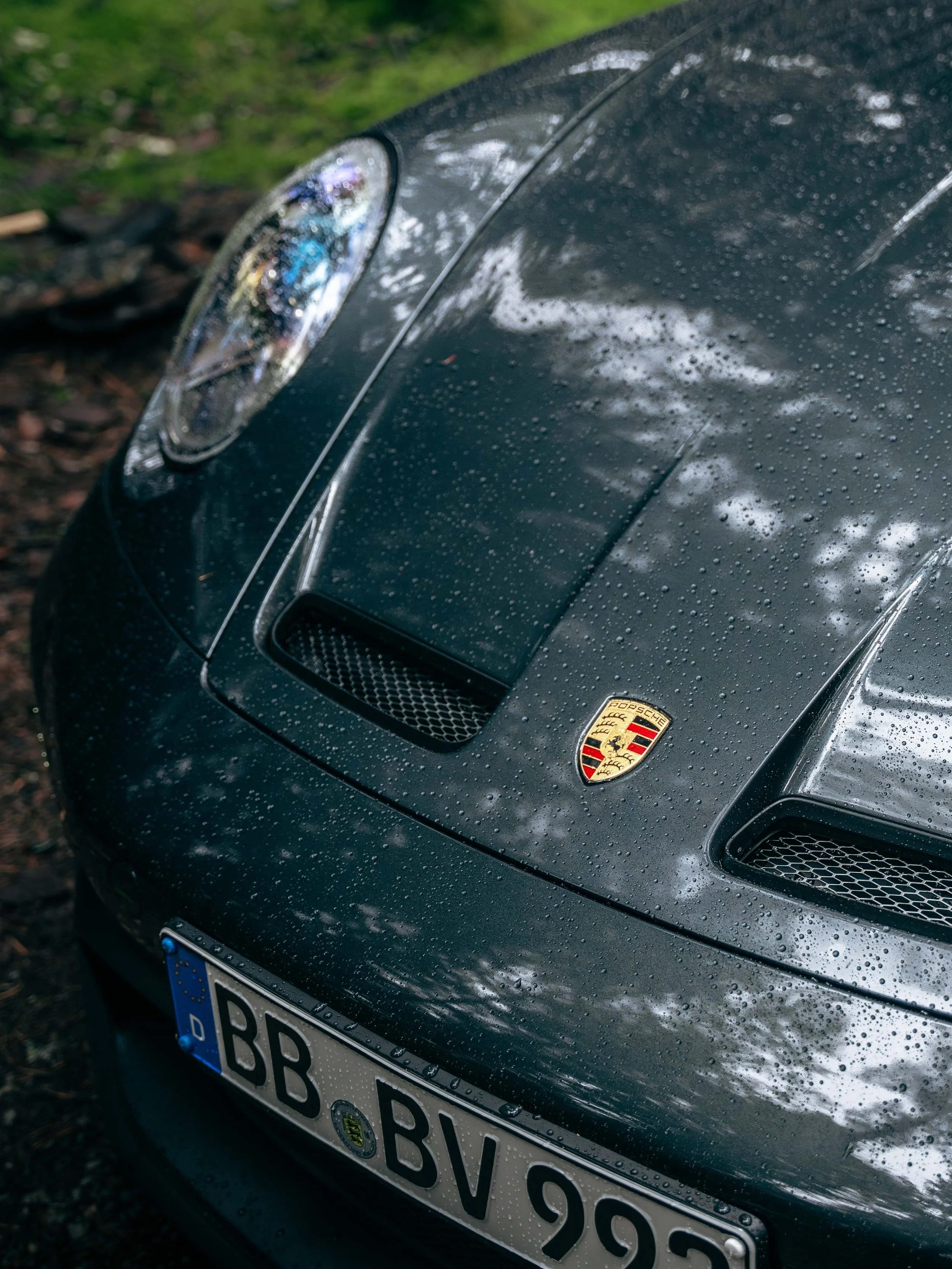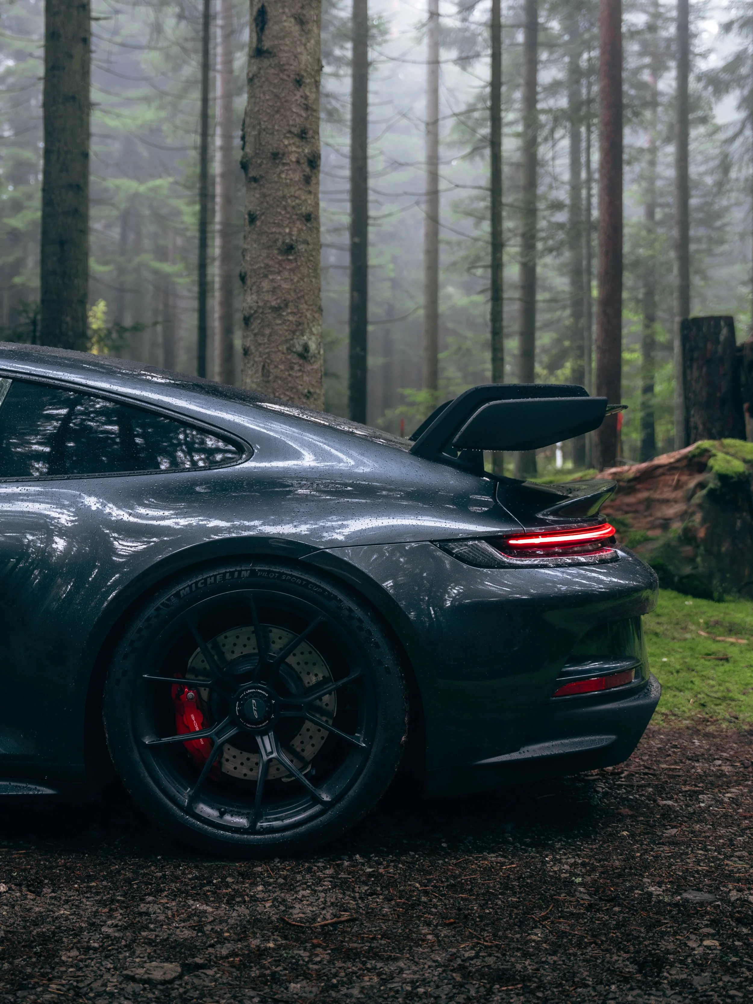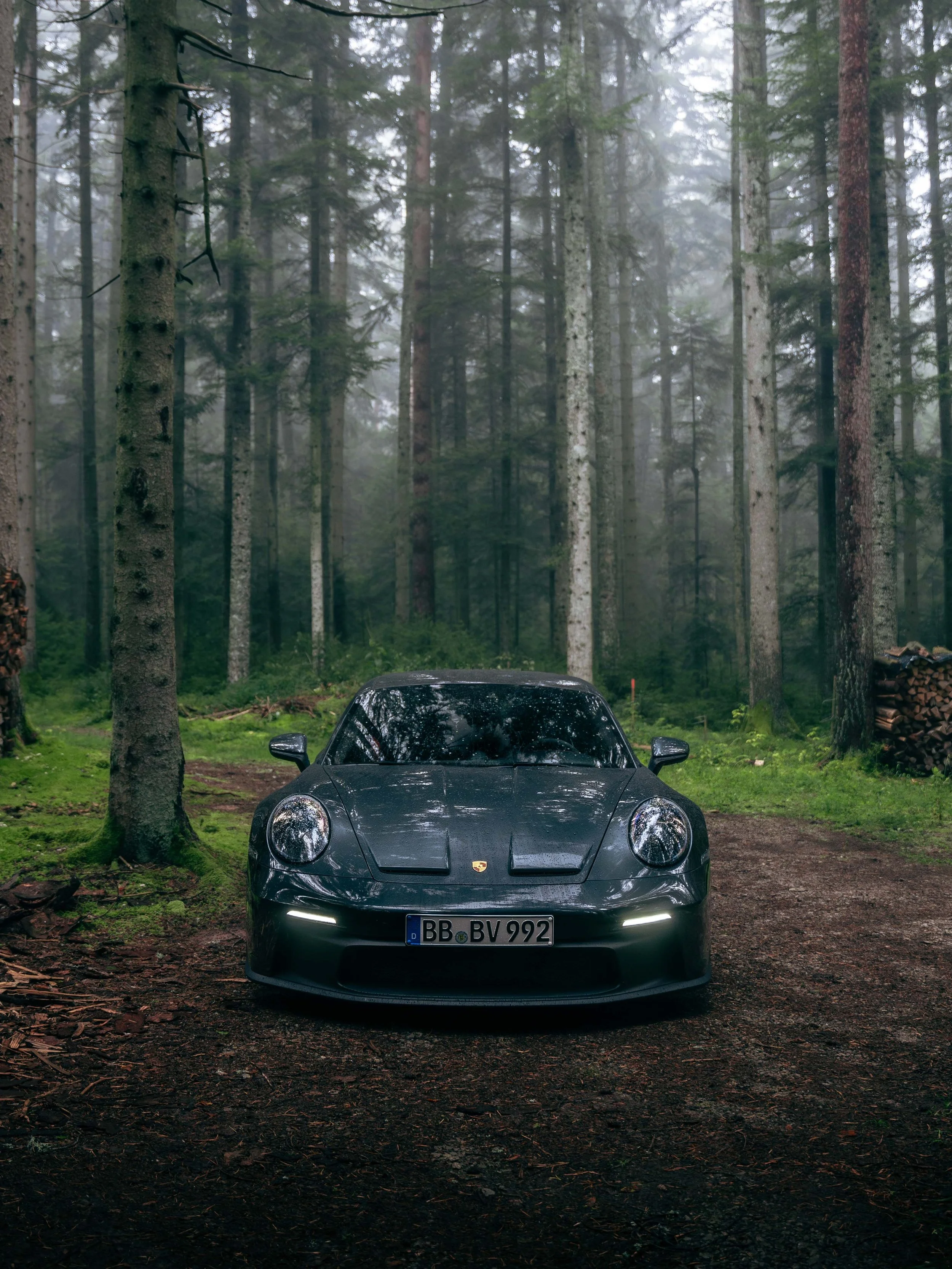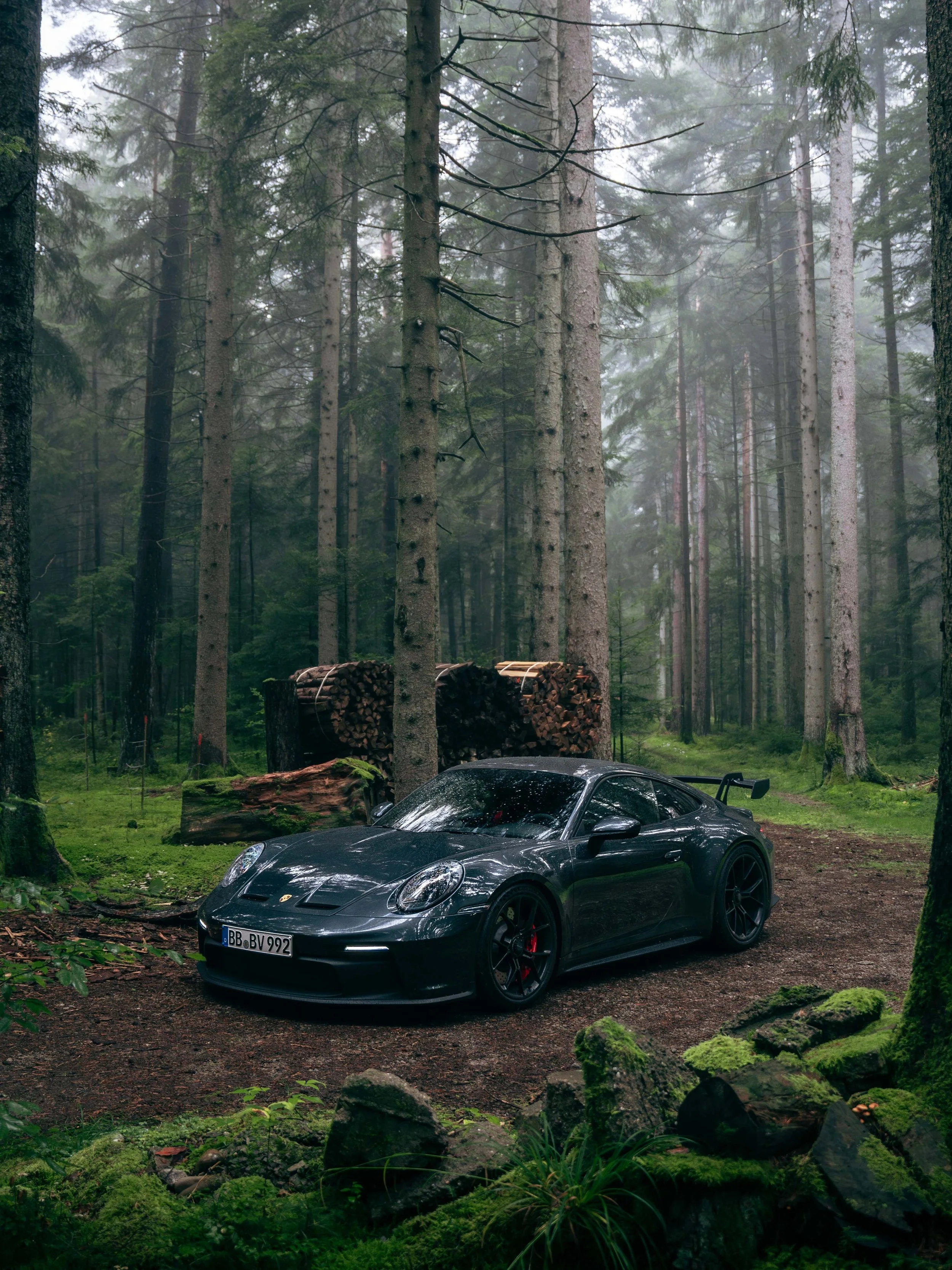 A winding road deep within the Black Forest set the stage for a drive as immersive as it was scenic. The dense greenery and damp terrain provided the perfect contrast to the sharp, performance-oriented lines of the Porsche 992 GT3. The overcast sky added an element of drama, enhancing the moody tones of the Carbon Steel Grey Metallic PTS paintwork as the car rested among towering trees and moss covered ground.